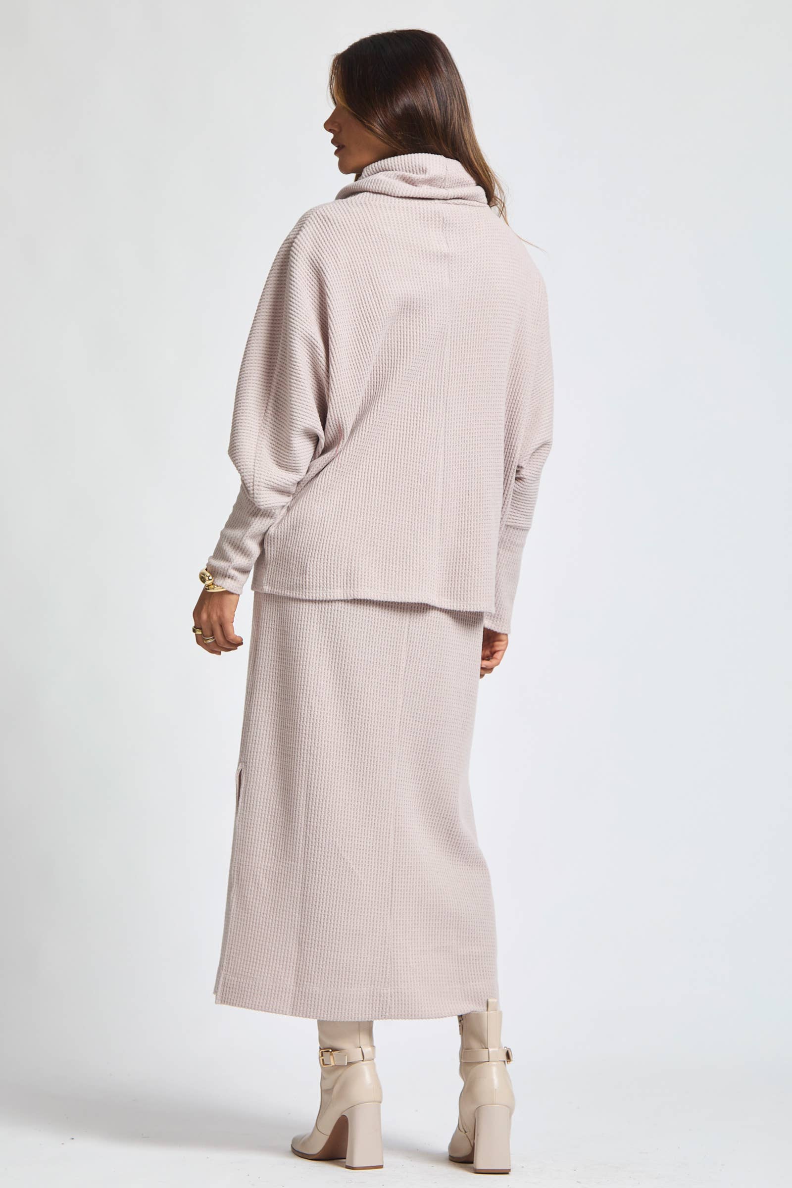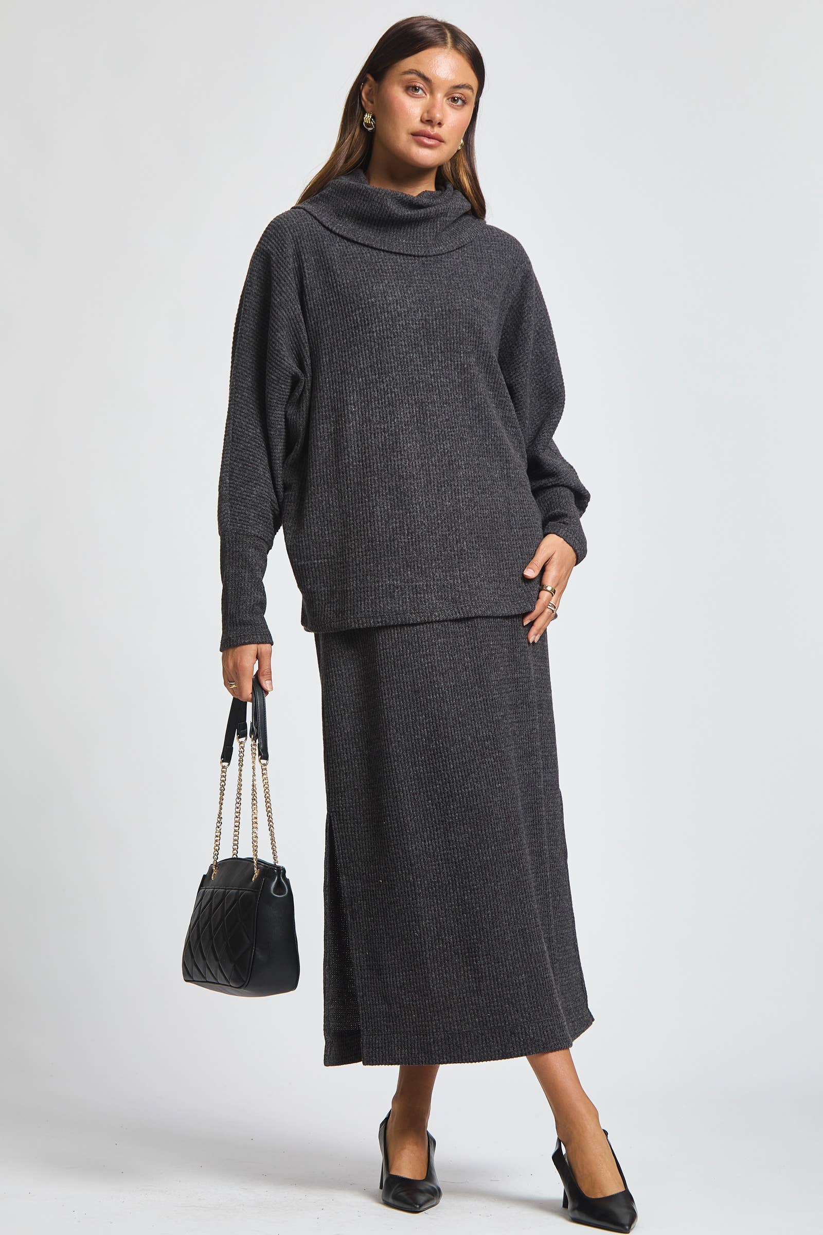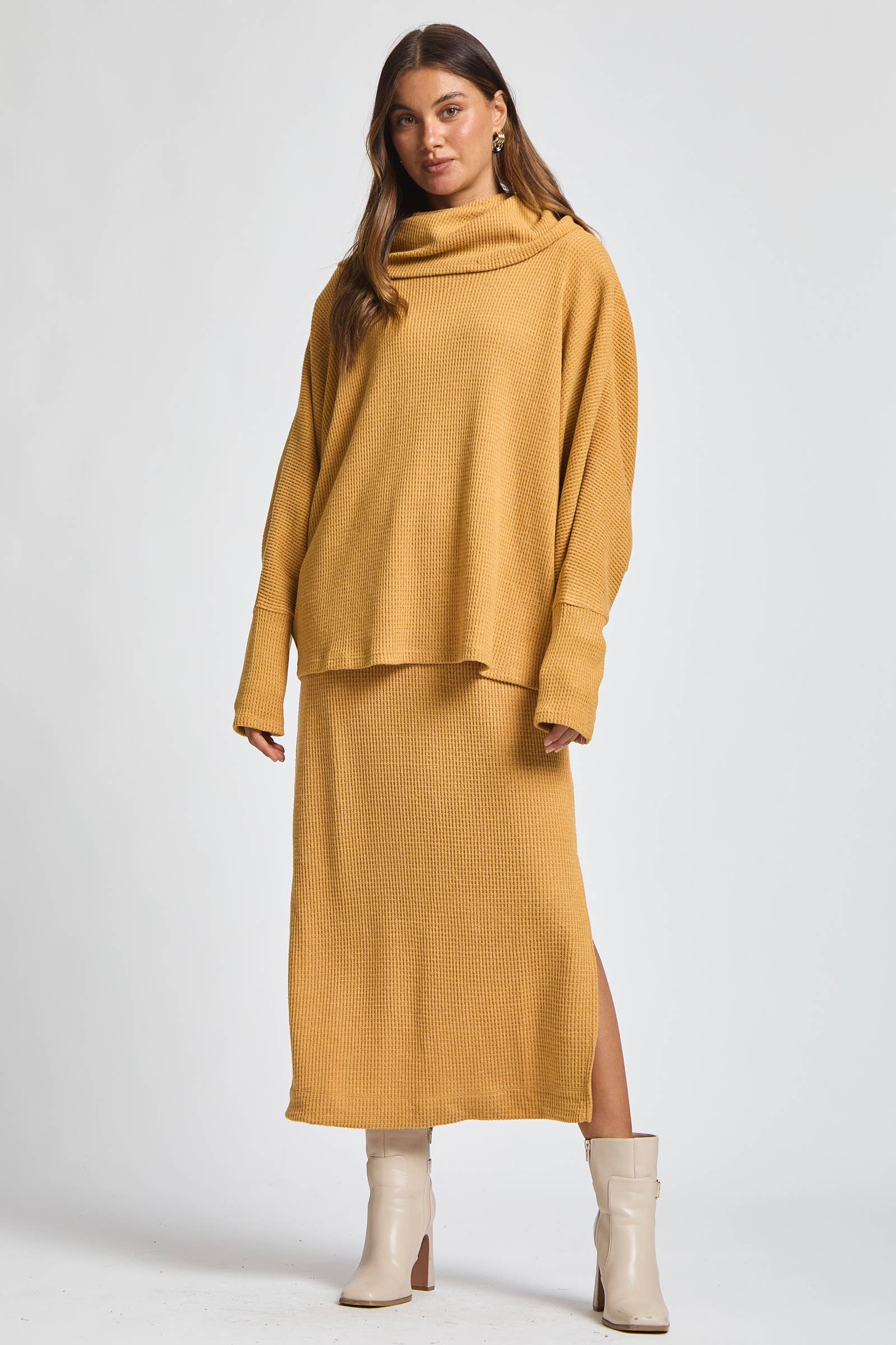 Cozy meets chic in this 2 piece set, featuring a soft brushed thermal cowl neck sweater layered over a flattering midi dress. The textured thermal fabric adds warmth and comfort, while the cowl neck brings a touch of effortless elegance. Whether worn together for a polished layered look or styled separately, this set is perfect for cool days when you want to stay cozy without compromising on style.