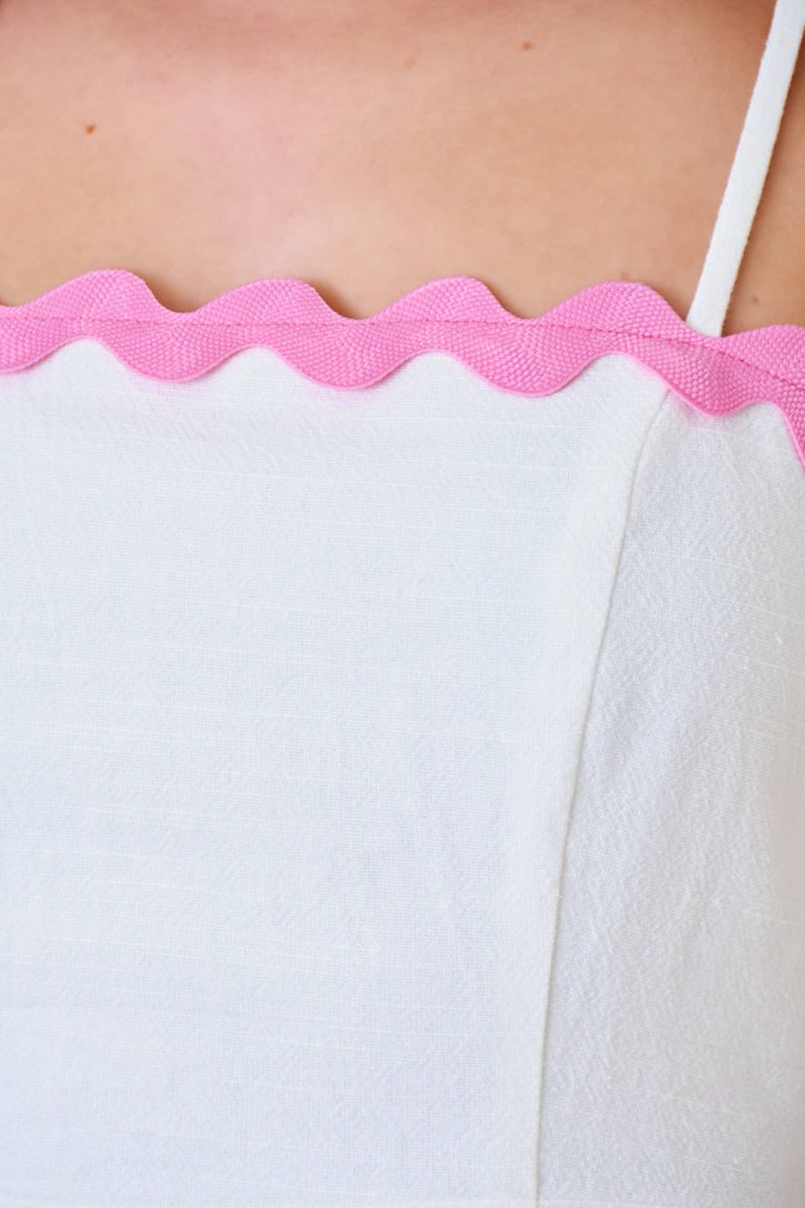Introducing our stunning Color Block Wave Trim Linen Blend Mini Dress. This elegant dress features a chic square neckline, complemented by delicate thin, adjustable spaghetti straps for a custom fit. The eye-catching wave contrast color block trim adds a unique touch to the design, while the mini length and hidden back zipper complete the look with a touch of sophistication.
