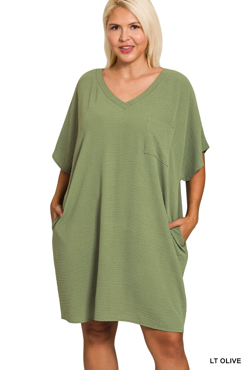 Plus Woven Airflow V Neck T Shirt Dress W/ Pockets