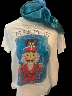 This whimsical Rare Bird design features a beautifully hand painted Nutcracker, full of charm and festive spirit. Above his ornate hat is the playful phrase CRACK ME UP. Surrounded in soft distressed blues, with bold red clothing for contrast, the artwork shines with personality. Rhinestones at the neckline add just the right touch sparkle. Printed on a tattered cotton shirt with an oversized fit, available in S/M - All oversized. Original artwork by RARE BIRD *ALL ITEMS ARE OVERSIZED AND NOT U.S. STANDARD SIZING - DUE TO THE VINTAGE SHABBY CHIC STYLE IN WHICH THEY ARE DESIGNED*