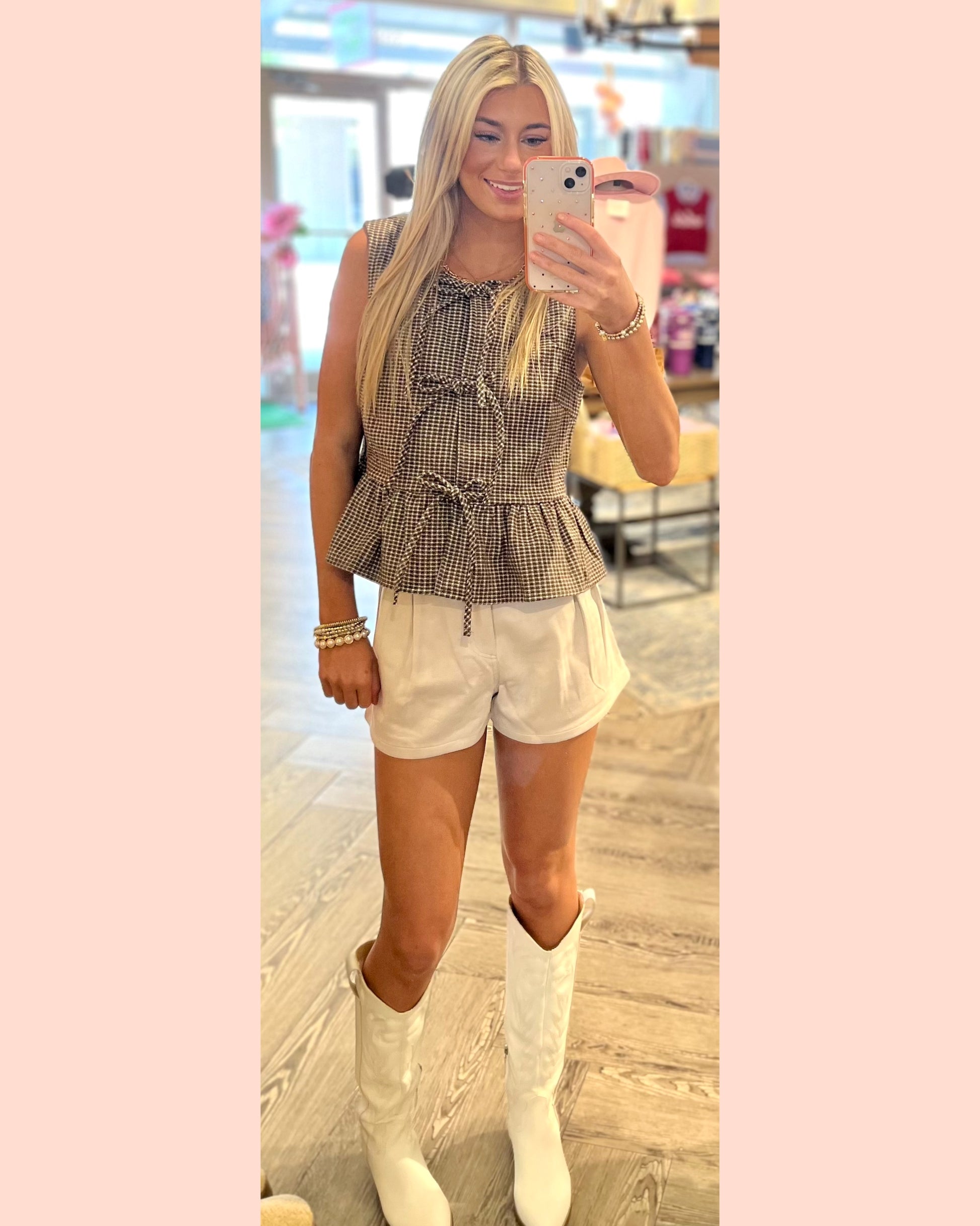MODEL IS WEARING A SIZE SMALL / HEIGHT: 5'7" SLEEVELESS CHECKERED TOP W/ FRONT TIE BOWS